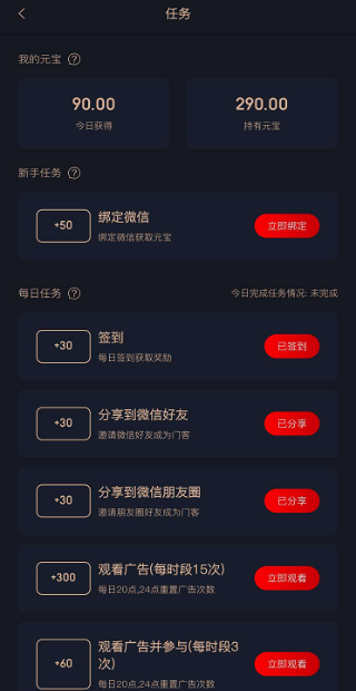 每日任务:签到,分享好友,分享到朋友圈都是30元宝,看视频一次是10元宝,可以看15次