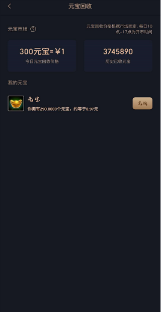 元宝分官方回收和商人回收,官方回收价格是300元宝兑换一元,商人回收是300元宝兑换2元