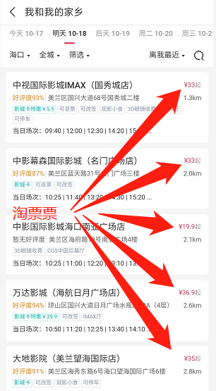 而我和我的家乡在支付宝上的淘票票电影票价格如下: