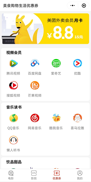 不仅如此,有票票微信小程序上还有影视会员优惠、外卖会员优惠、音乐会员优惠等