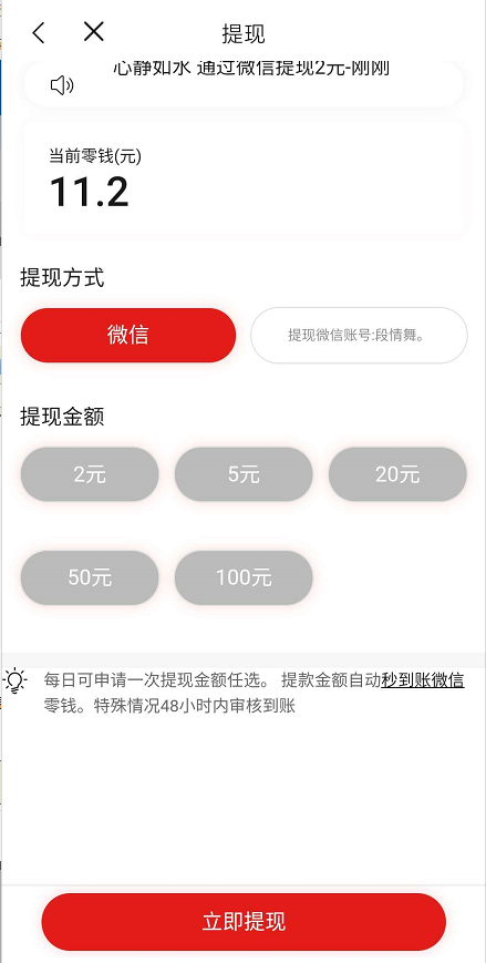 微信提现、2元起提现,提现秒到账,一天只能提现一次。