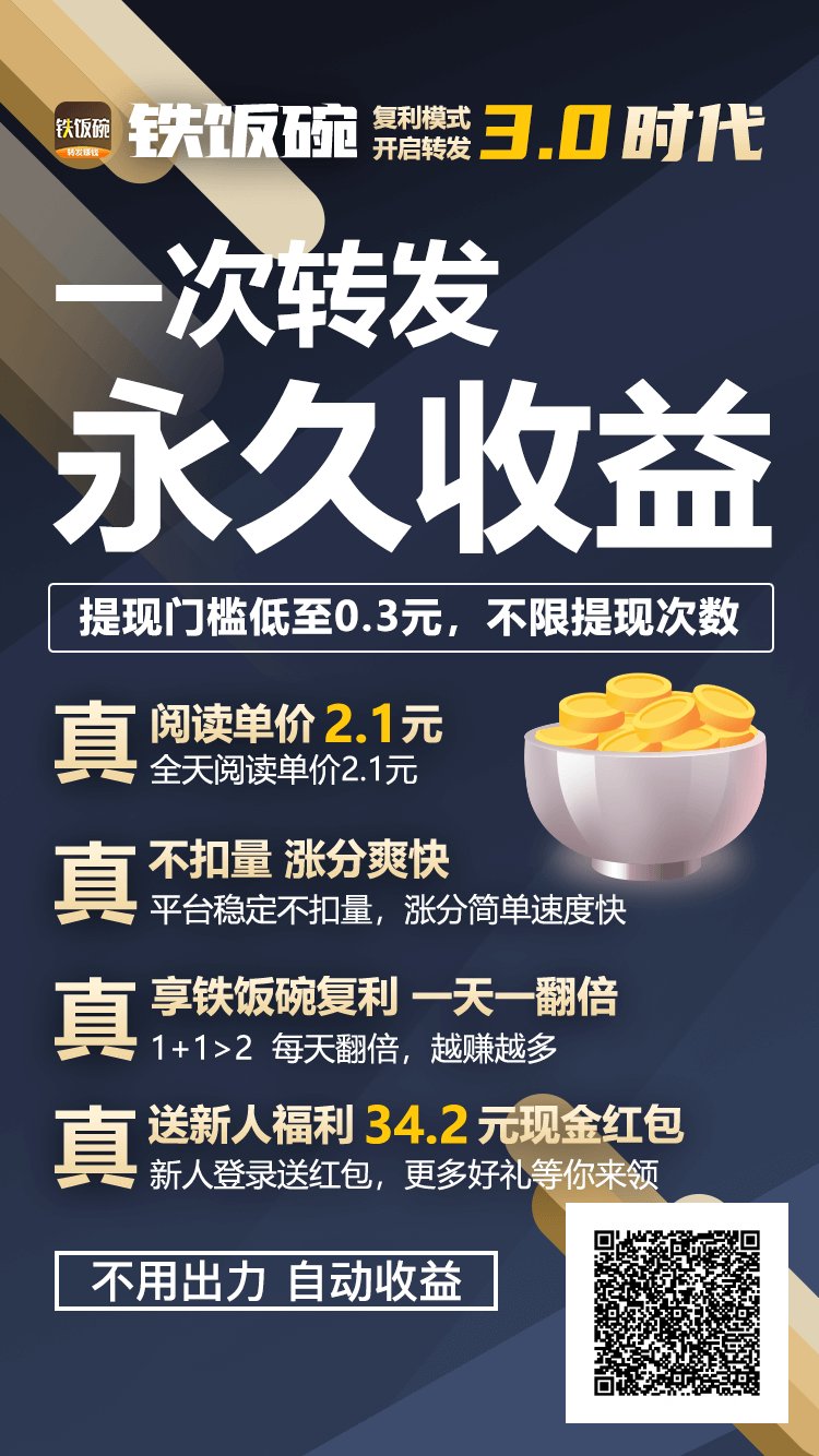 铁饭碗是我们对于稳定工资的说法,一般来说这类的工作都特别受到人们的青睐,别的不说,就因为收入稳定,能给自己的生活带来一定的保障,如果有一份铁饭碗的工作摆在面前,我相信80%的人都会毫不优惠的选择,老段也不例外,而最近中国文化传媒集团出品的一款手机赚钱软件转发赚钱的平台就叫铁饭碗!据说一天收益福利后能达到60元一天,一起来看看怎么玩~