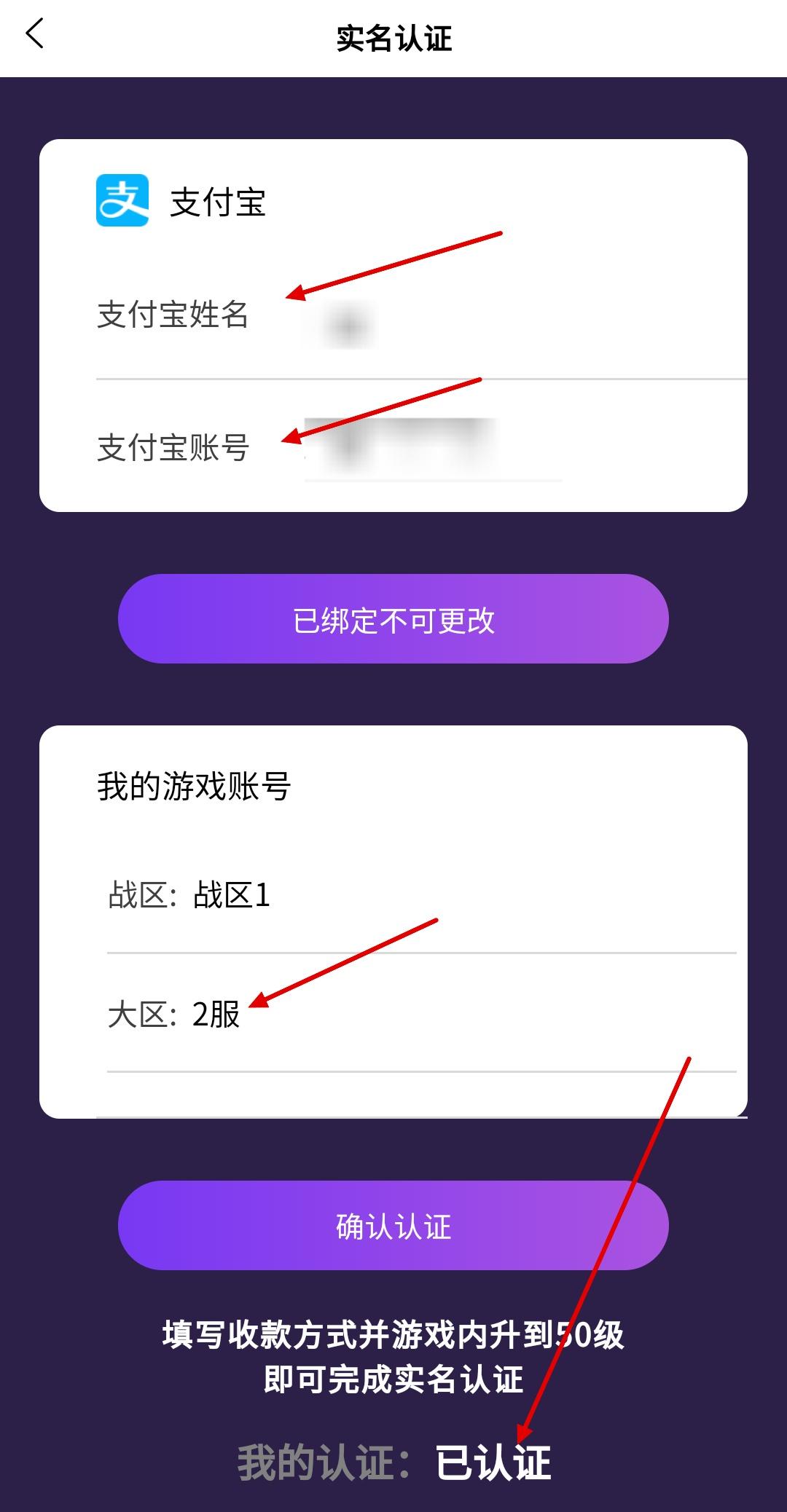 等级达到50级后,点击我的—实名认证,完成绑定支付宝和游戏选取绑定即可,不需要身份证认证!