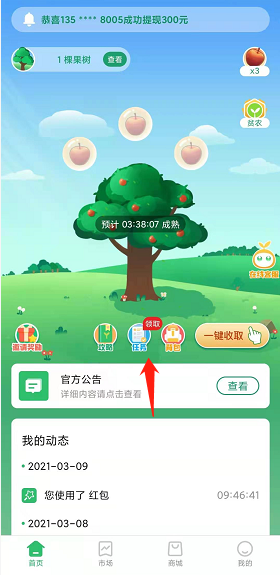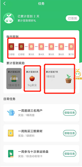 有小伙伴可能没注意到还有个签到任务,累计签到5天送1KG果实,签到7天再送一棵果树