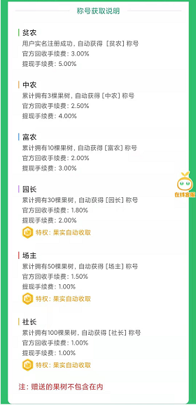 还有一个果农称号,随着等级的提升,会降低官方回收手续费,提现手续费,自动收取果实