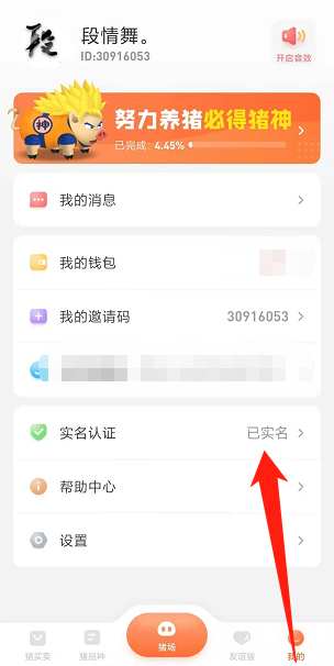 2、下载好一起来养猪APP后,在我的页面完成实名认证(仅绑定支付宝方便提现,无需其他实名操作)