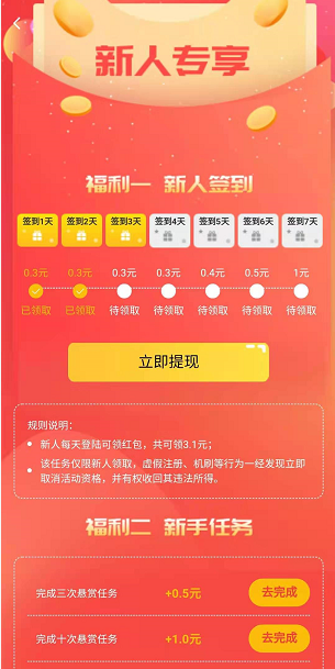 3、除了上边这几块钱、新用户注册后每天都可以签到领红包,签到7天一共3.1元奖励、感兴趣的可以去签到撸个毛~