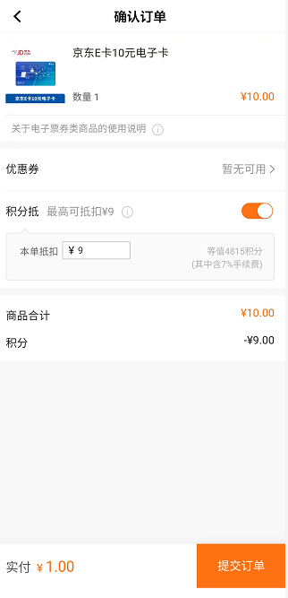 3、最后就是首页搜索E卡,兑换10元的E卡第1次购买E卡是1元,第二次换是5元,相当于6撸20元E卡,如果想用E卡的可以绑定京东购物,如果没需求或者想兑换现金也可以回收