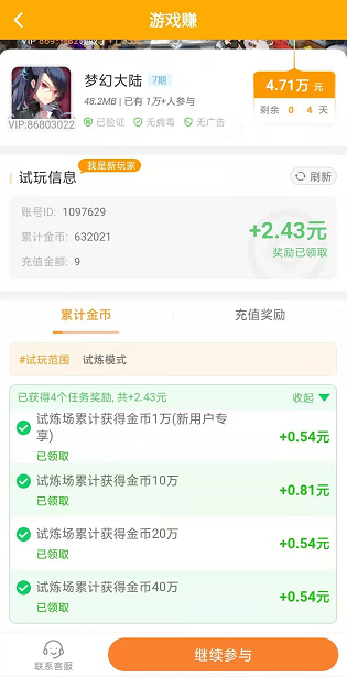 梦幻大陆游戏奖励总金额4.71万元