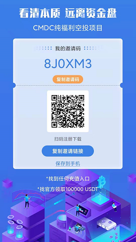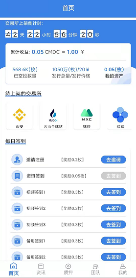 CMDC空投105万枚发行价格20元每枚,最强0撸每天签到送0.05枚CMDC,看一个广告获得0.3枚,每天可以看三个广告,剩余42天上市各大交易所
