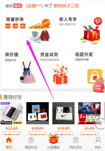 注册成功后,白天11点到晚上9点都有秒杀活动,所谓的秒杀活动就是申请就中奖,中奖就能马上下单: