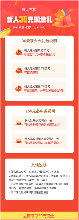 这个时候30元现金就来了,里面有几十个可以秒杀的活动,你只要当天申请3单的秒杀,就可以拿到30元现金的奖励。