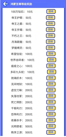 就在今天共享游戏上线了一款官方回收游戏装备的游戏,叫鸿蒙至尊,奖励非常高,100万钻石=10元,剩下装备很多,最低50元起回收,直接看截图会更清楚,更多回收装备价格请下载APP查看