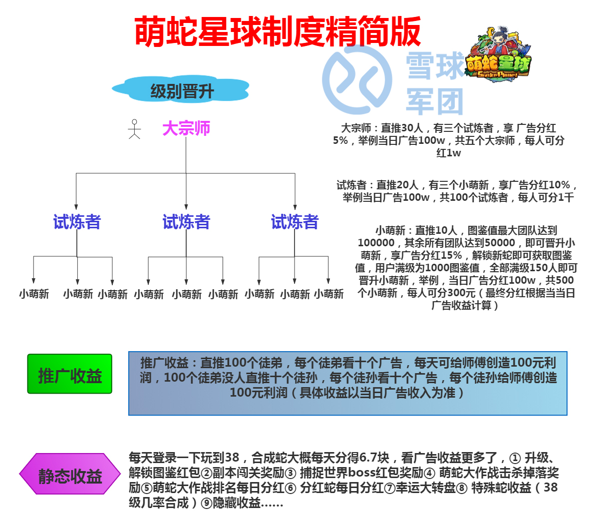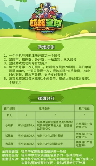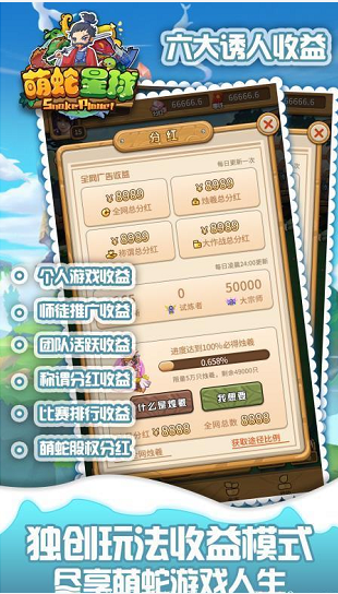静态零撸:升级、解锁图鉴红包;副本闯关奖励;捕捉世界boss红包奖励;萌蛇大作战击杀掉落奖励;萌蛇大作战排名每日分红;分红蛇每日分红;幸运大转盘;特殊蛇收益(38级几率合成);隐藏收益(股权收益)