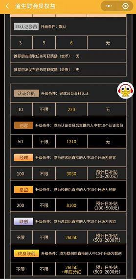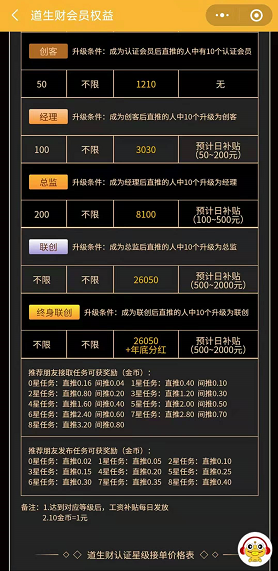 推广奖励,半仙也不给大家写了,官方的这张图更清晰明了,如果图片看不清的话,大家可以移步到道生财app内可以看得清楚,推荐好友发布任务也有奖励