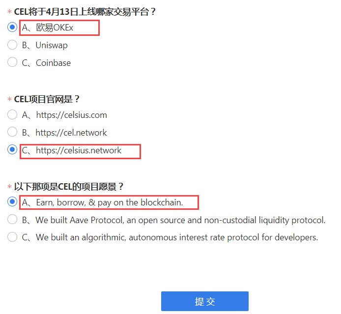 答题&分享空投活动总额为20,000美金CEL,根据先到先得的规则发放,参与用户需正确答题并完成KYC2验证。