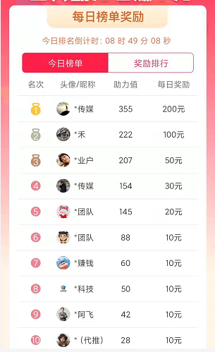1、每日签到,邀请好友登陆、完成任务、提现,均可获取助力值,按累计助力值排名,每日前十名获得现金奖励,排名越高奖励金额越大;