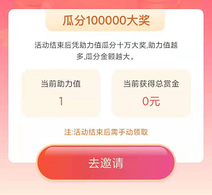 1、活动结束后凭助力值瓜分10万奖金,助力值越多瓜分金额越大,奖金需到活动页手动领取,超时(24h)未领取自动失效。