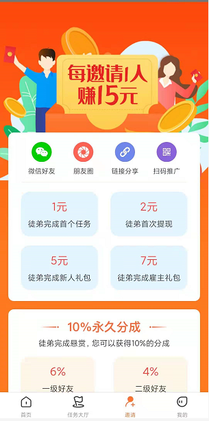 每邀请一位好友奖励15元现金 10%两级用户任务分成。