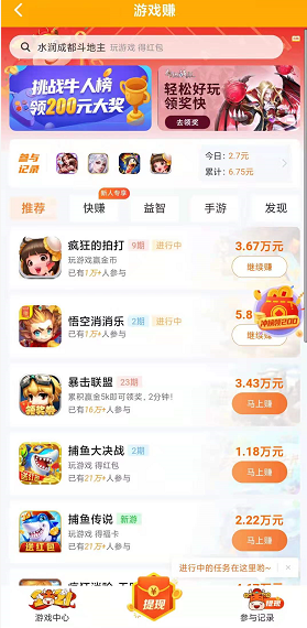 游戏赚APP,拥有海量的赚钱游戏,奖励能拿多少全看自己的实力,并且还有冲榜奖励,挑战牛人榜,更多的冲榜奖励等你来拿