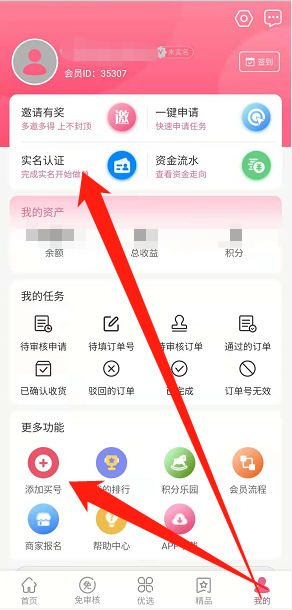 1、下载登录优选试用,先完成实名认证,所有接单平台都是需要完成实名认证的。完成实名认证后在添加买号,就是你自己的淘宝、京东、拼多多账号。