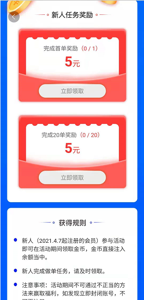 ①新人任务奖励10元,完成首单额外奖励5元,完成20单在奖励5元。