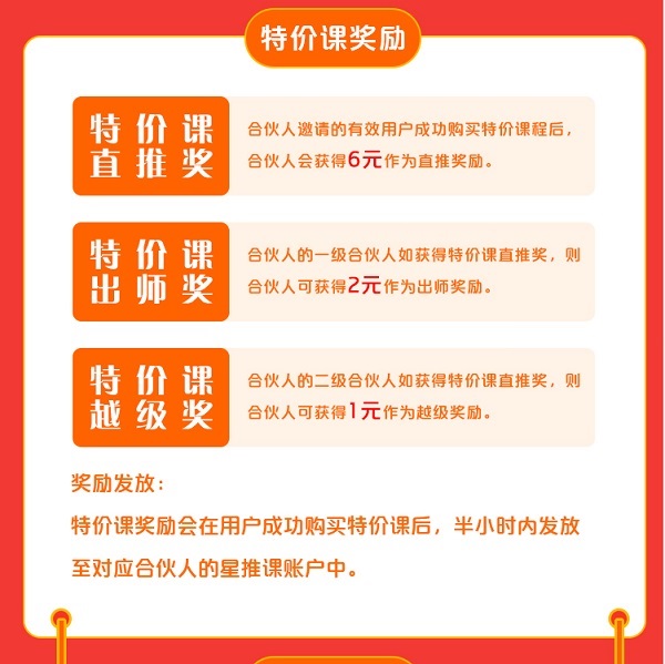这里需要注意一下,首先用户必须先购买特价课之后买正价课才有提成,直接购买没有奖励的!其次购买提成有效期是特价课买入到开课后14天,此外,正价课收益是分3个月发放的(毕竟这种课程有可能中推退课也是理所当然)