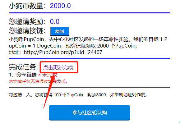 PupCoin小狗币正在进行空投,简单填写ETH地址即可获得2000小狗币的空投,分享链接到朋友圈、推特、微博、群等其一,空投简单零撸就好,凡是遇到充值的空投不要充值,以免资金受损,凡是遇到充值的空投不要充值,以免资金受损,凡是遇到充值的空投不要充值,以免资金受损