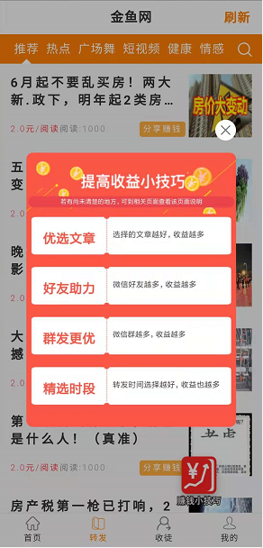 金鱼网App是转发分享文章赚钱的平台,把平台上的文章分享到微信,分享的文章有人阅读就有钱拿,金鱼网App 的文章价格是2元,也就是说我们分享的文章每有效阅读一次就有2元现金,一天100次有效阅读就是200元的收益,打个对折也有100元的收益,我们每天把一些有干货的文章分享到朋友圈、微信群坐等收益即可!