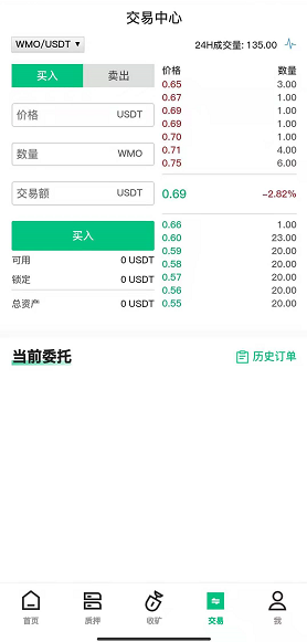 新用户注册并且简单实名认证即可免费挖矿,15天可以挖12枚WMO币,满5枚可以质押挖矿,已经开启交易,目前WMO的价格是0.7-0.8U相当于每天赚4-5元之间