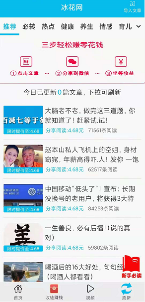 转发文章赚钱的软件收益对于新手来说是非常之高,操作简单,分享文章就能赚钱,分享文章出去后坐等别人阅读级就可以获得收益,冰花网App的转发单价4.68元,别人看一次你赚4.68元,100个人看你分享的文章你就能赚468元~