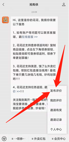 1、微信扫码关注抢购侠公众号,关注后右下角会员中心找到发布评价入口。