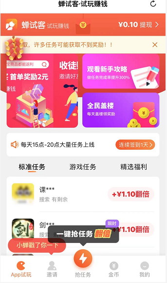 蝉试客说老也不老,说新也不新,毕竟是2018年就上限了的,也同样是试玩应用赚钱,单价都是在1元以上,蝉试客操作非常简单,简单下载一下app体验个几分钟就能拿下奖励,拿到任务了就要做,任务是有时限要求的,如果不做就没了,满10元即可提现,支持微信支付宝提现