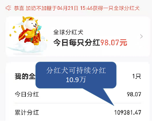 从分红犬的收益来看,平台的热度渐渐退了去。旅行世界团队当初也未曾想到会突然爆火,我想大概是去年的玩法模式的创新性以及平台的靠谱度吧。发展两年还从未出现过提现问题,依旧是当天提现隔天到账!