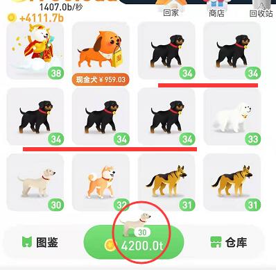 我们每合成一个新的等级,都要忍住手,不要着急再升一个等级,而是继续合成出更多相同等级,直至空间不足无法合成。如图:现在是34级的狗狗,基础合成是30级,那么就继续合成出更多34级的狗狗,直到空间不足后,再升级到35级。