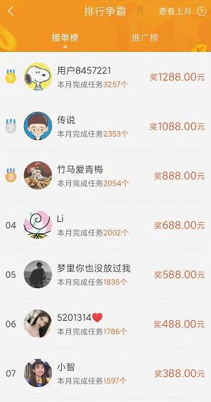 悬赏猫同样作为一款老牌的悬赏任务平台,拥有不同的奖励系统,玩家接单榜单,每月的接单榜单玩家都会有额外的现金奖励,第一名1288元,同样拥有大量的悬赏任务,各种任务,完成就能获得现金奖励。