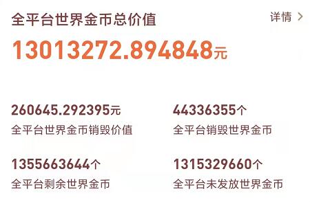 平台世界金币总价值已经突破1300万,这里没有水分哦,都是平台用户共同创造的价值总和。