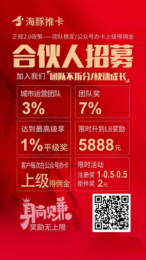 海豚推卡活动,推荐成员注册成功,直推奖1元,间推奖0.5元,间间推奖0.5元。活动二,指定银行拒件奖励2元。活动三,升到最高级别L8代理奖5888元,此奖励只限3月、4月。