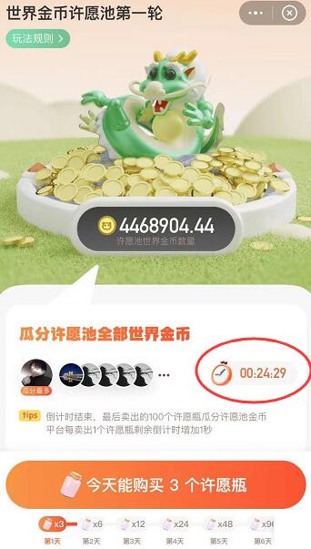 今晚的许愿池是调整之后,也许是第一次开奖。最后一位购买许愿瓶的用户,可以直接瓜分许愿池25%的世界金币。