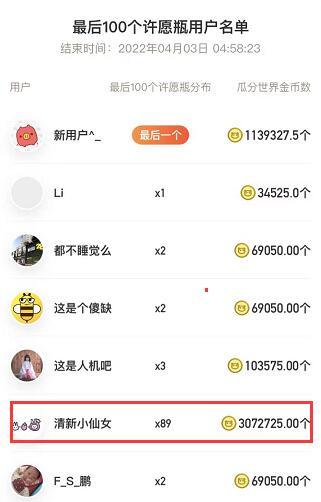 最后一个购买瓶子的用户也有100多万金币,收益也有6-7万了。纯粹的肝帝啊!有两位获得69000枚金币的用户,也有4300左右的收益了,基本工资都有了。