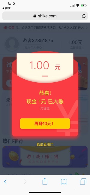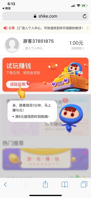 4、在首页点“试玩赚钱”,系统会提示下载助手,类似安卓手机的客户端app。