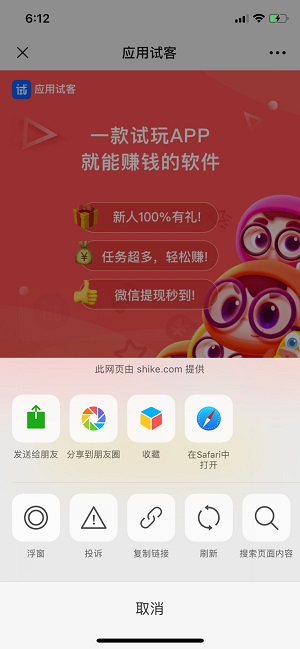 2、扫码后进入应用试客首页,微信页面无法下载,点击下图所示“在Safari中打开”,跳转到iPhone自带浏览器中打开该页面。