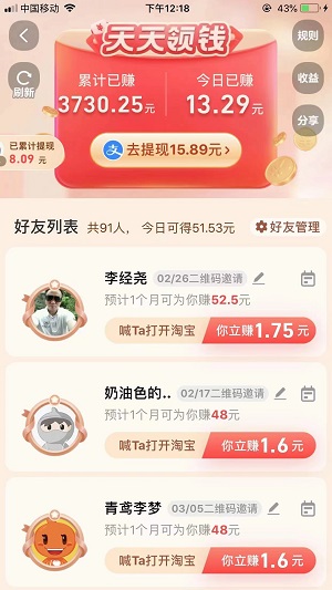 淘宝官方活动简介里说“邀请10个好友,每月多赚100元”,照此计算,一个好友每天登陆一次大约贡献0.3元,早期不限制邀请人数,现在规则有限制,每人最多邀请50人,也就是说一天收益15元左右,一个月也有个几百块钱,0.01元就可以提现,秒到支付宝。