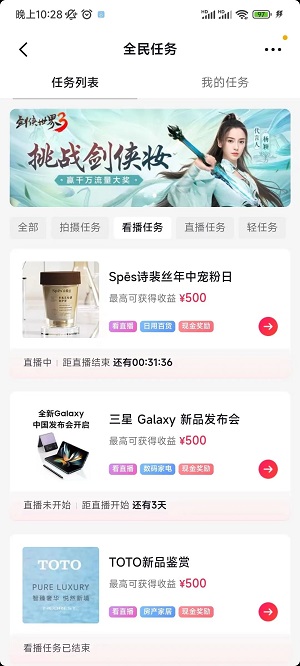 在进入全民任务界面之后就能看看到很多小任务,选择看播任务。