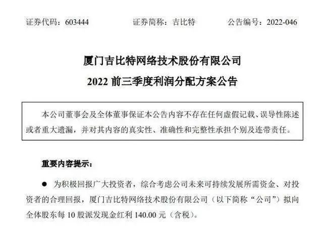按照披露的前三季利润分配方案,这家游戏公司拟每10股派发现金红利140元(含税),合计拟派发红利10.06亿元。净利润10.12亿元,分红就发了10.06亿元,这是什么概念?这意味吉比特将公司前三季度净利润的99.45%拿出来分红了。