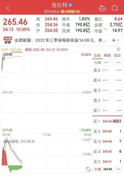 不知是不是受到吉比特的“壕无人性”的分红方式影响。10月27日早上,吉比特的股票(603444.SH)股价快速上扬,不到半小时就封于涨停。截至收盘报265.46元,涨幅10.00%,总市值190.78亿元。