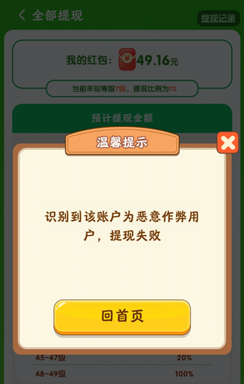 我是农场主可以提现吗?无法提现,小编提现49显示实际到账0.49元,但是当我点击提现却提示我是恶意用户。