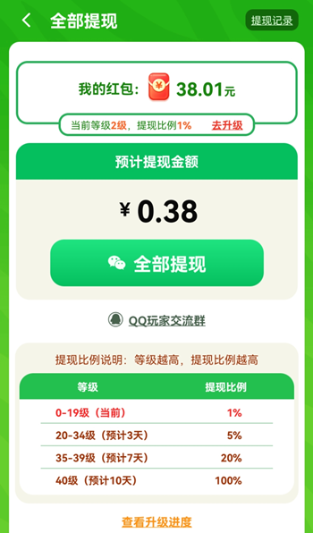 小编试了下红包提现,满30元就可以提现了,提现比例是1%,也就是说提现30元只能到账3毛钱,提高游戏等级可以提高到账比例。然后元宝提现的话是要满30元才能提现的,而且元宝获取的方式很少,给的也少,所以元宝提现不是很现实。