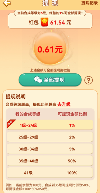 其次就是元宝提现,这个也是需要50元以上才能提现的,这个元宝奖励好像很少,基本上都是红包,而且领这个红包也是需要看广告的,这个提现是满0.3元就能提现了,但是需要30元,然后到账是3毛钱,只能得1%,要想获取更多比例,就需要提高合成等级了。