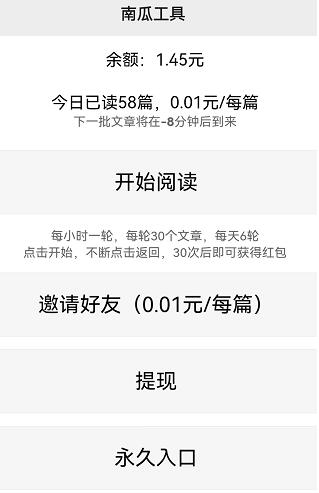 南瓜工具这款微信阅读项目不论是操作玩法还是收益模式都非常清晰明了而且简单,每篇微信阅读3秒收益0.01元,每一轮最多可以阅读30篇文章,每天可以阅读6轮,每次间隔最短为1小时。